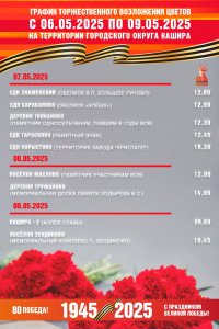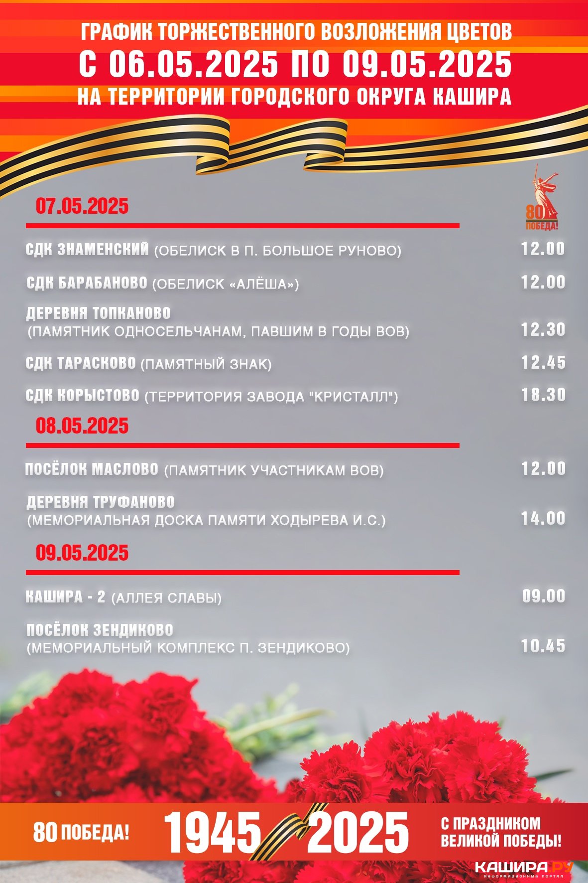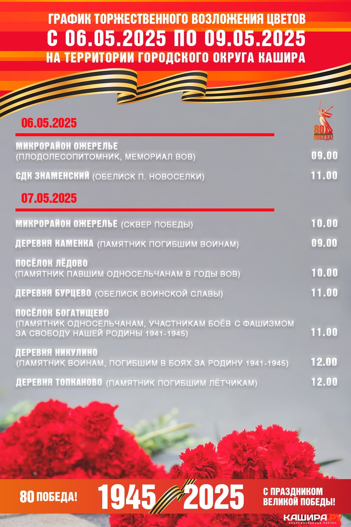 С 6 по 9 мая в Кашире пройдут церемонии возложения цветов к памятникам погибшим воинам