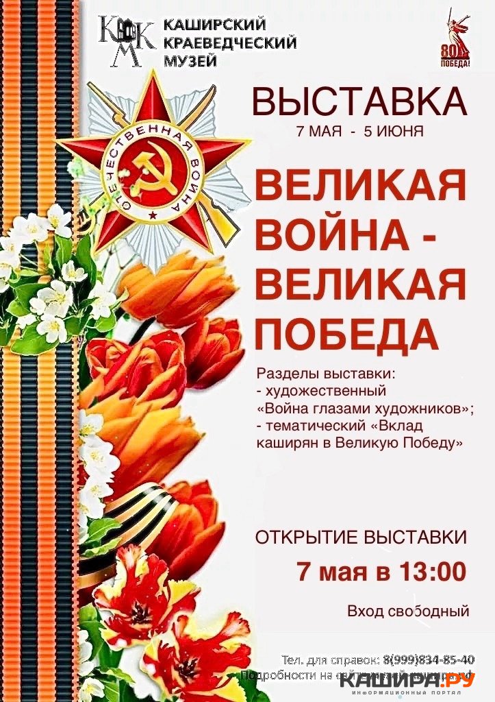 7 мая в 13.00 приглашаем каширян в краеведческий музей на открытие выставки «Великая война - Великая Победа», посвященной юбилею Великой Победы.Она рассказывает о земляках-героях Великой Отечественной войны. Они сражались с фашистами в небе, на земле и в воде. Ковали Победу на передовой и в тылу, в партизанских отрядах и на трудовом фронте. Вместе со всей страной они прожили эти тяжелые и долгие 1418 дней войны.
