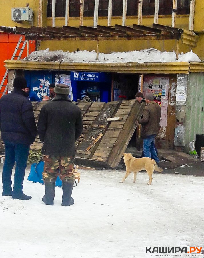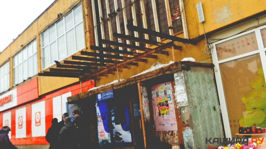 На выходных в торговом центре, расположенном на ул. Победы в Кашире-3, неожиданно решили демонтировать аварийный навес над центральным входом. А неожиданным это событие можно назвать хотя бы потому, что за здание давно никто не брался всерьез, так что даже минимальные подвижки к улучшению не могут не ободрять. Понятно, что сам козырек уже давно износился, представляя опасность для всякого, кто входил или выходил из торгового центра. Как видно на снимке, деревянное основание навеса имело далеко «не свежий» вид, а образовавшийся на сверху снежно-ледяной покров не сулил ничего хорошего изношенной конструкции.