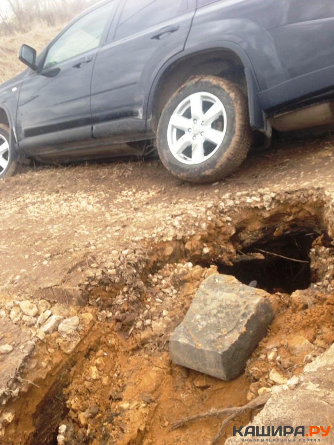 Неприятный казус случился в конце апреля с одним из жителей городского округа Кашира: подъезжая к деревне Корытня, его автомобиль стал заложником аварийного участка дороги. А проще говоря – ушел колесами под землю, завалившись набок. Вот, что написал сам «пострадавший»: «Дорогу размыло, яма диаметром 1,5 метра, половина деревни остались отрезанными, добраться до своих домов невозможно. Необходимо положить сливную трубу и подсыпать насыпь и утрамбовать. Провалилась машина».