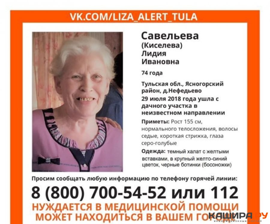 В Тульской области, а именно – в деревне Нефедьево Ясногорского района пропала 74-летняя Лидия Ивановна Савельева, которая 29 июля 2018 года ушла в неизвестном направлении и с тех пор место ее нахождения неизвестно. О пропаже и начале поисков сообщает ее внучка: «Бабушка дезориентирована, у нее сосудистая деменция, она четко помнит только свои имя и отчество. Очень важно найти ее как можно скорее».