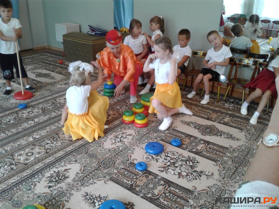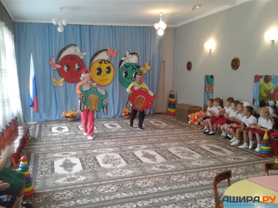 Подготовительная к школе группа разделена на три команды по цветам светофора. Началась игра интересно. В зал, под звучание весёлой музыки, на бутафорских машинах въехали клоуны Сигналкин и Мигалкин. Их присутствие и активное участие в игре вызывало интерес у детей и хорошее настроение.