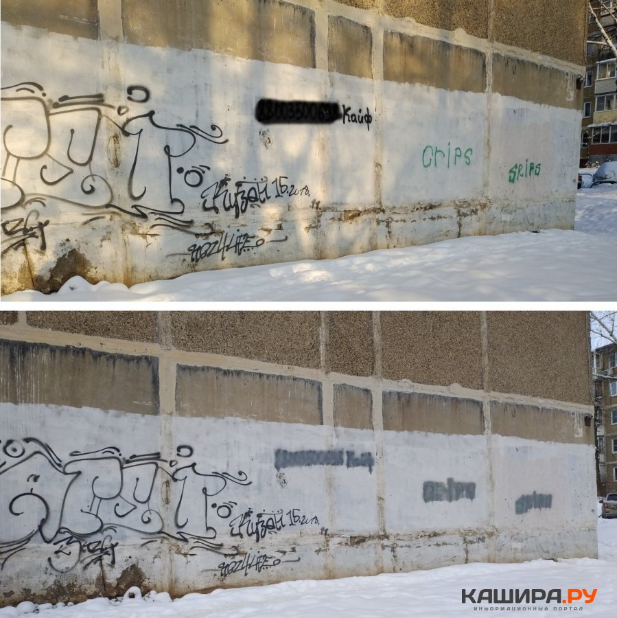 Периодически, как правило, несколько раз в год на домах и прочих строениях в городском округе Кашира, словно грибы после дождя, начинаются множиться надписи с телефоном и характерной «припиской». «Соль», «Дурь», «Кайф» – все это ни что иное, как реклама наркотиков. В декабре такие надписи снова заполонили наш округ, однако в первозданном виде «покрасовались» совсем недолго. На борьбу с уличной рекламой наркотиков вышли неравнодушные каширяне. Активисты в Ожерелье, к примеру, решили закрасить некоторые надписи альтернативным слоганом «Займись спортом» (свою работу они выложили в сеть). А в Кашире, как на пятиэтажке с главного фото, их просто закрасили.
