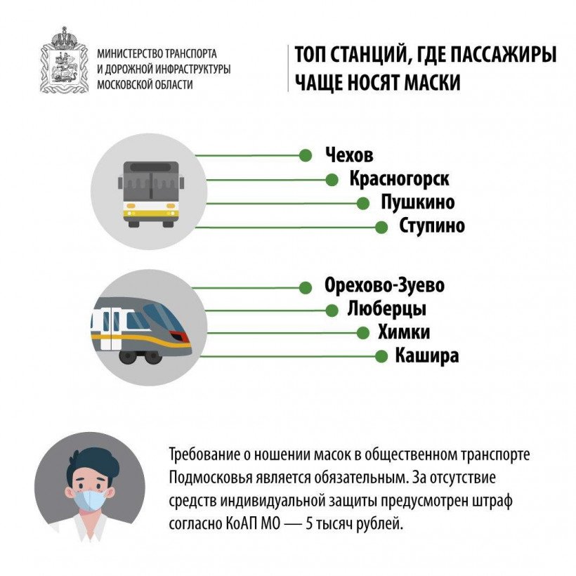 Областной Минтранс озвучил результаты проверок соблюдения масочного режима на транспорте пассажирами и водителями. Как выяснилось, среди пассажиров автобусов меньше всего нарушали в Чехове, Красногорске, Пушкино и Ступино. А вот на железнодорожном транспорте самые дисциплинированные «носители» масок оказались в Кашире, в также в Орехово-Зуево, Люберцах, Химках.