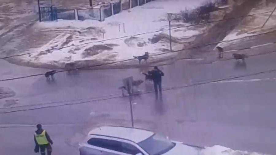 В объектив камеры видеонаблюдения попал момент нападение собак возле рынка в Кашире-1. Стая, как минимум, из семи бездомных животных бросается к переходящему через дорогу мужчине.