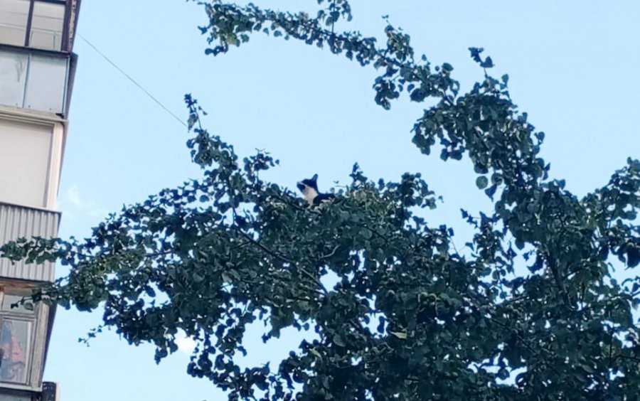 Работники противопожарно-спасательной службы осмотрели дерево, определили место нахождения кота. Спасатель по трехколенной лестнице поднялся на дерево, сняв обессилевшее животное и передав его хозяйке.
