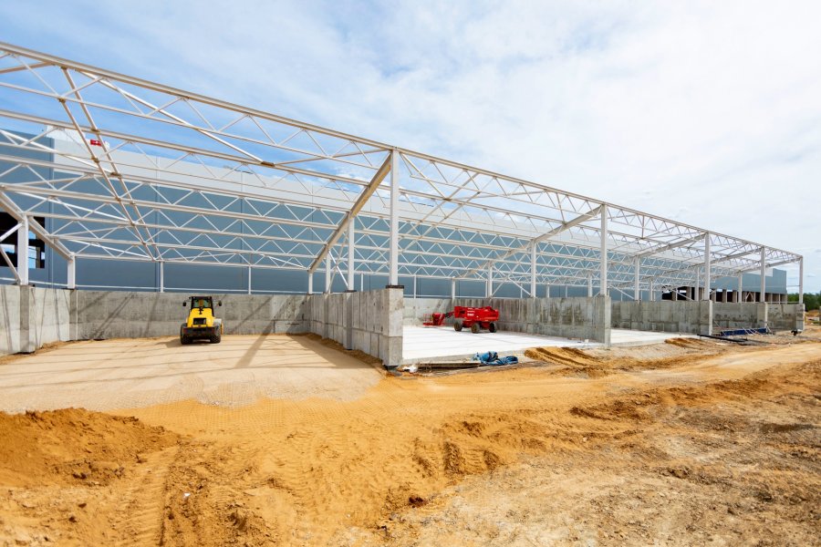 По данным застройщика, в главном производственном корпусе сегодня ведется монтаж зенитных фонарей, металлоконструкций и сэндвич-панелей, завершается устройство кровельного пирога, бетонирование приямков и подготовка основания для промышленных полов.