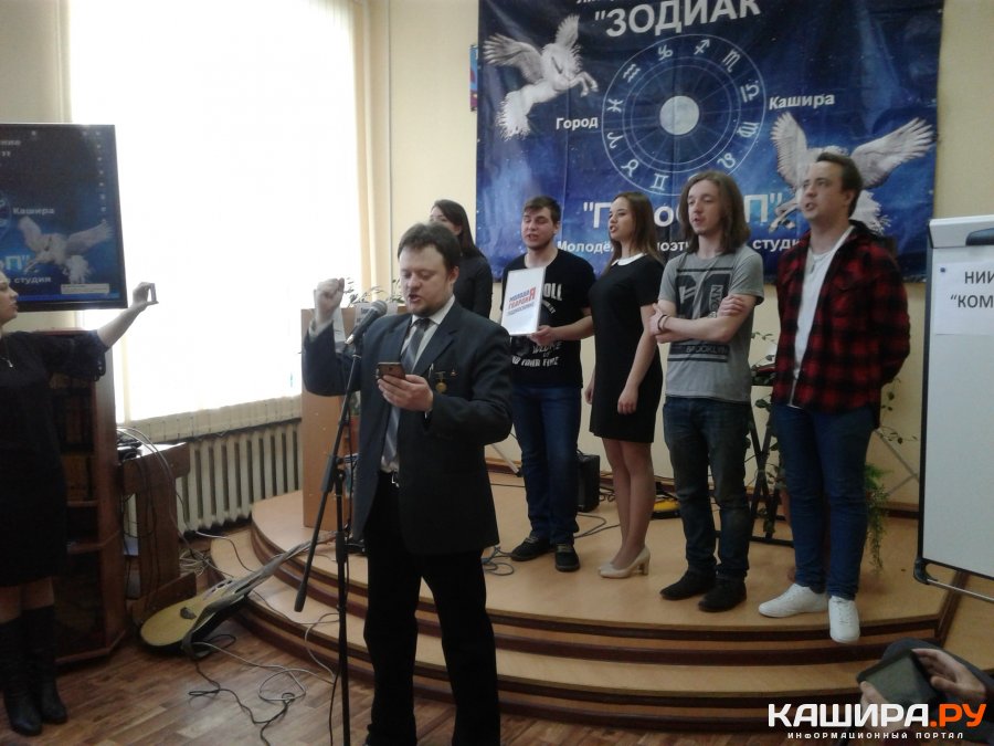 25 февраля 2018 года объединение отметило 15-летие. Для зрителей было много сюрпризов и подарков. Торжество состоялось на славу. Наталья Елизарова, член Союза писателей Москвы, от души поздравила объединение, подарила журналы, собственную книгу и прочитала свои произведения. В этот вечер звучало много стихов и прозы в исполнении членов литературного объединения, а также гостей праздника. Заведующая детской библиотекой О.К. Филькова сказала много добрых слов и пожеланий в адрес поэтов. На протяжении всего вечера Михаил Рудаков, заведующий молодёжной литературной студией "ГороСкоп", в образе Чарли Чаплина исполнял куплеты - гороскопы для разных знаков зодиака, вызывая улыбки зрителей. В праздничном мероприятии участвовали члены театральных студий «Щука» Д/К на Стрелецкой и «КаРаТ» на Клубной. Порадовала гостей миниатюра в стихах Андрея Тернова, исполненная артистами студии «Карат». Были и музыкальные подарки. Рок группа «Дуэт-квартет» явно подняла настроение. Наталья Бузовкина – директор Каширского молодёжного центра, исполнила позитивные песни. Зрители не смогли усидеть на месте, пустились в пляс. Наталья Бузовкина, она же и руководитель Каширского отделения «Молодая гвардия», предложила исполнить флешмоб - гимн России, в поддержку наших олимпийцев, хоккеистов, ставших золотыми медалистами. Акция получилась очень красивой. Молодая поэтесса, Юлия Хлебникова, вместе со своей семьёй подарила поздравление в стихах и торт в виде книги. Торжество получилось красивым, насыщенным по содержанию. Мероприятие закончилось чаепитием. Всё удалось!
