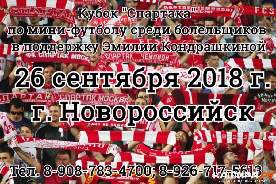 26 сентября в 11:00 на поле стадионе «Строитель» в городе Новороссийске выйдут команды-участницы благотворительного турнира Кубок «Спартака» по мини-футболу среди болельщиков. Соревнования пройдут в поддержку маленькой девочки из Каширы Эмилии Кондрашкиной, за здоровое будущее которой уже не первый год борются ее родные и все неравнодушные люди. Организатором турнира выступает фан-клуб ФК «Спартак» в лице Владимира Федоровича Гришина и при поддержке КБ «Кашира». Сообщается, что средства, собранные на благотворительном турнире, будут направлены на лечение тяжелобольной малышки Эмилии.