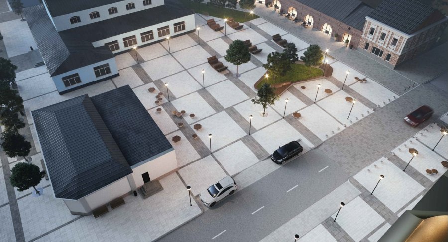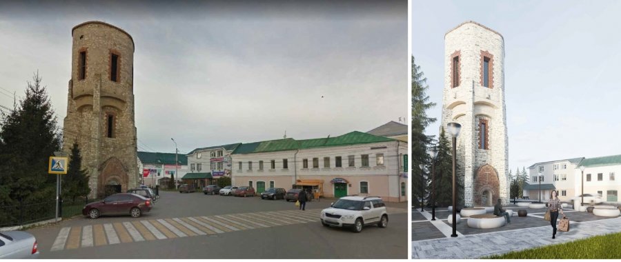 Ниже по улице запланировано мощение тротуарной плиткой с установкой малых архитектурных форм на площади перед водонапорной башней.