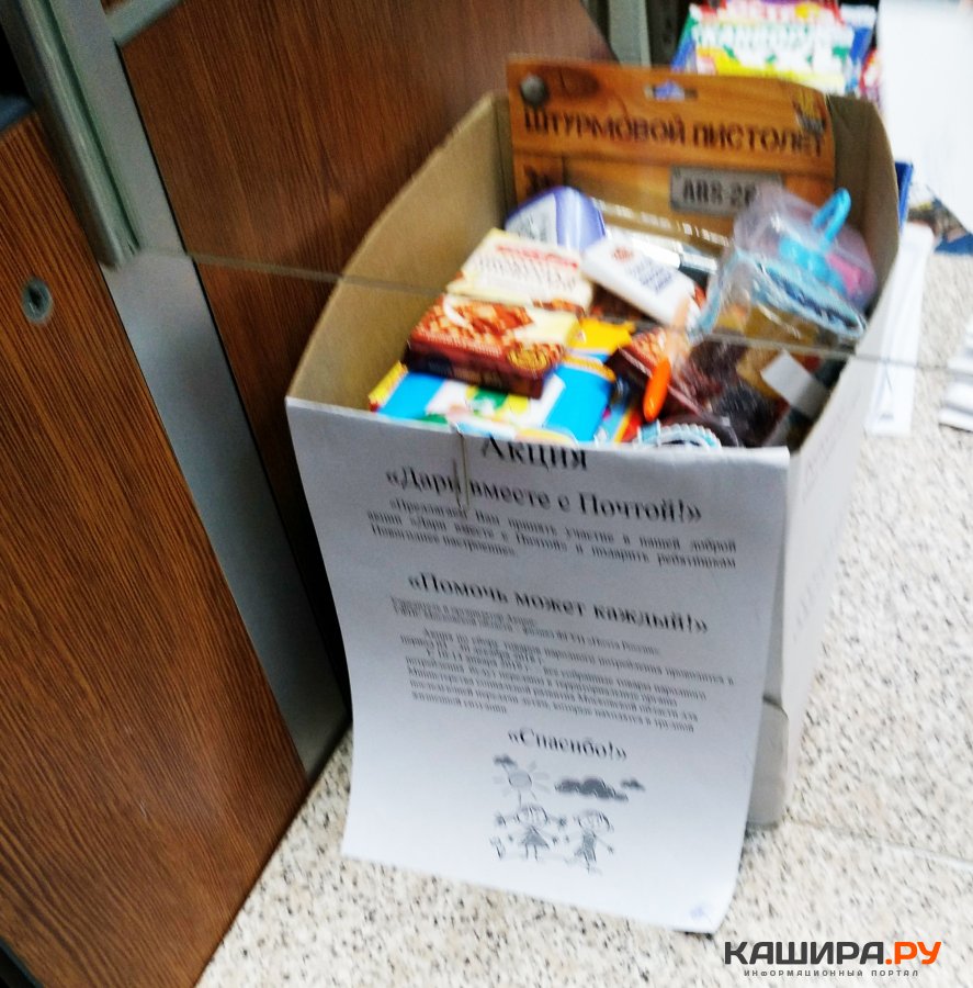 В отделениях «Почты России» в городском округе Кашира завершается благотворительная акция «Дари вместе с почтой», которая проходит с 3-го по 30-е декабря 2018 года. «Предлагаем Вам принять участие в нашей доброй акции и пожарить ребятишкам Новогоднее настроение», – гласит ее девиз.