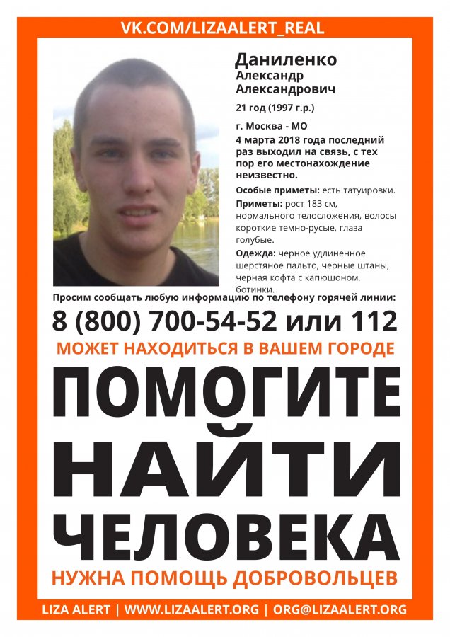 Ровно год назад стало известно о пропаже 21-летнего (на тот момент) Александра Даниленко, который ушел из дома в деревне Тарасково городского округа Кашира в неизвестном направлении. В последний раз он выходил на связь 4 марта 2018 года. С тех пор место нахождения Александра неизвестно. Спустя год родные не оставляют попыток узнать о нем хоть какую-то информацию. Мы уже неоднократно сообщали, что все это время поиском молодого человека занимается отряд «Лиза Алерт». Неоднократно проходили обходы территорий, опросы, обзвоны учреждений, распространение листовок.