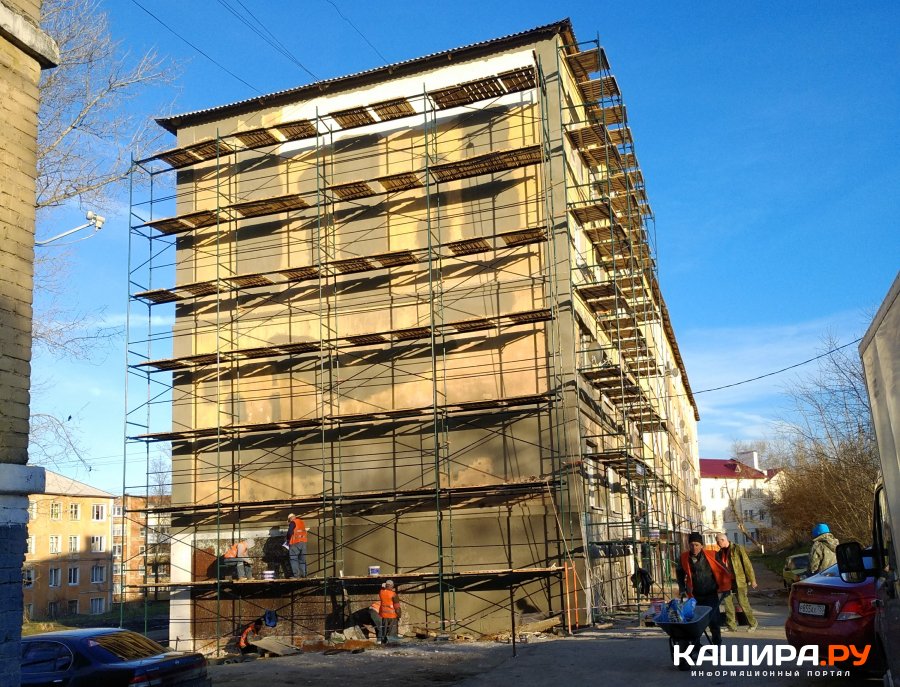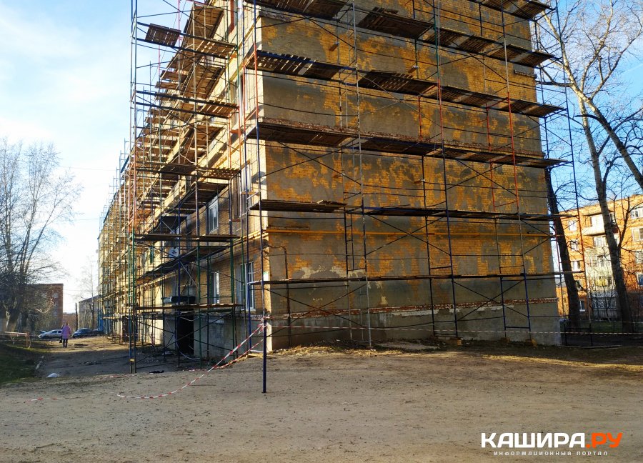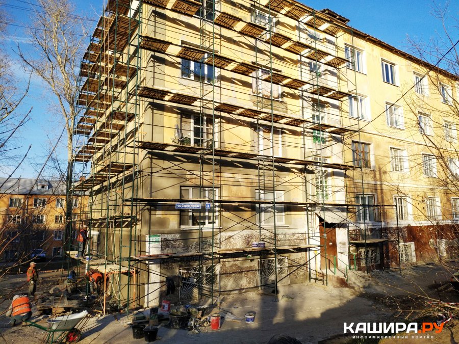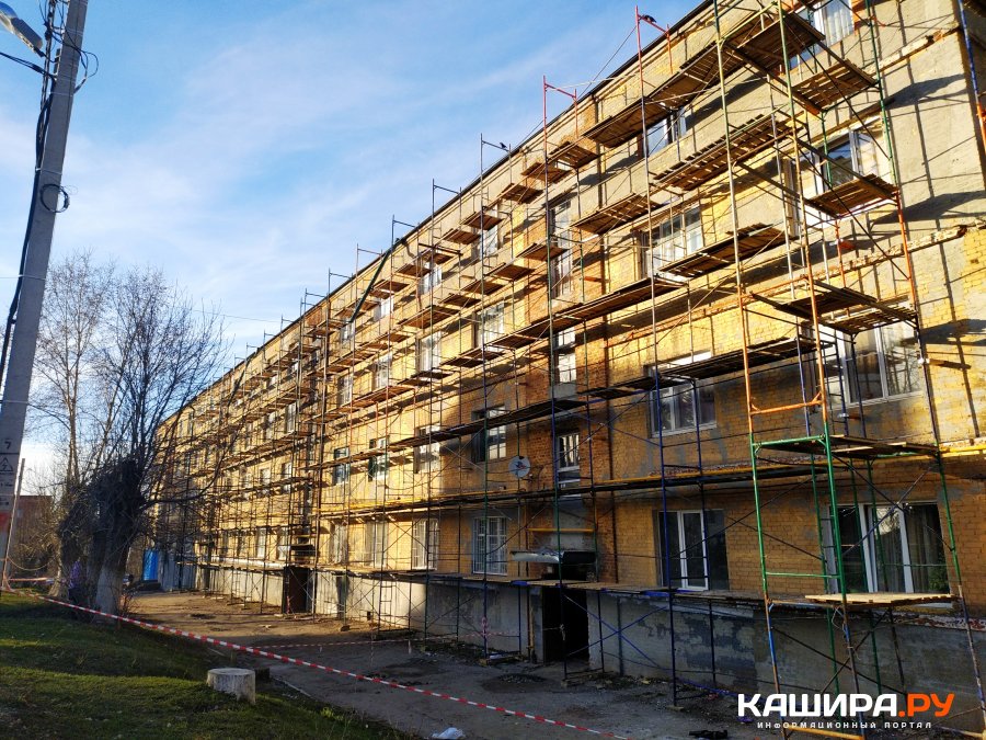 Четырехэтажки на улице Сергея Ионова в Кашире-2 сегодня не узнать. Известные (по разным причинам) в городе дома обнесены строительными лесами, бригады рабочих осущетвляют подготовительный процесс с грунтованием стен.
