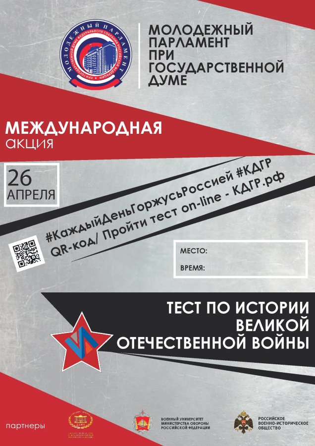 26 апреля 2019 года состоится традиционная международная акция «Тест по истории Великой Отечественной войны». В преддверии Дня Победы всем желающим будет предложено проверить знания о самом трагическом периоде истории человечества.