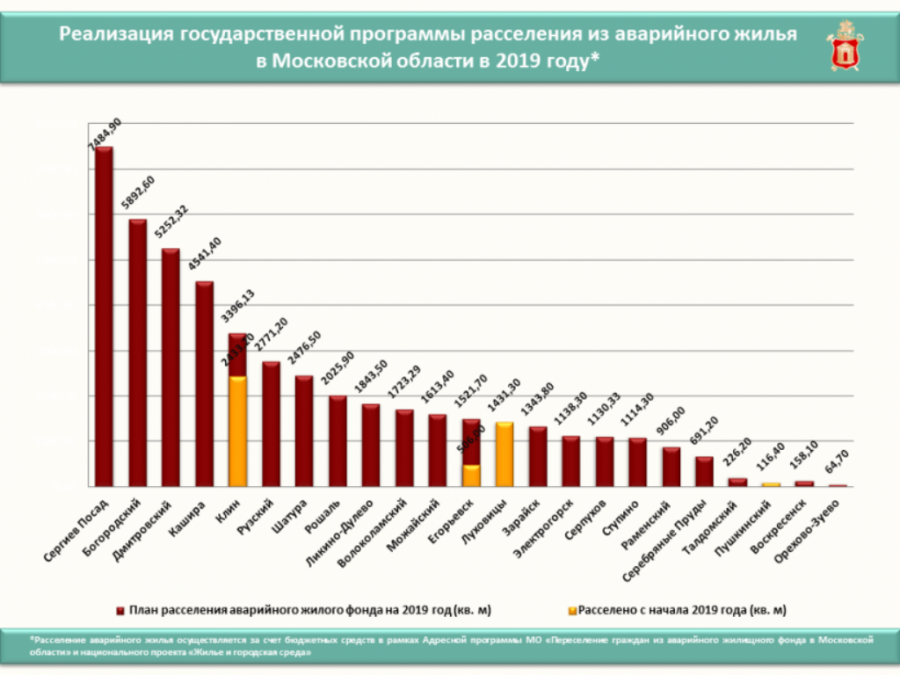 Министерство строительного комплекса Московской области обнародовало рейтинг муниципалитетов-лидеров по числу аварийного жилья под расселение, которое осуществляется в рамках реализации госпрограммы переселения граждан из аварийного жилищного фонда 2019 года. В первую пятерку районов и округов с наибольшим метражом расселяемого жилья вошла и Кашира. Наш округ, где планируется расселить 4,6 тысяч кв. метров жилой площади, оказался на четвертом месте, пропустив вперед Сергиево-Посадский, Богородский (бывший Ногинский) и Дмитровский округа.