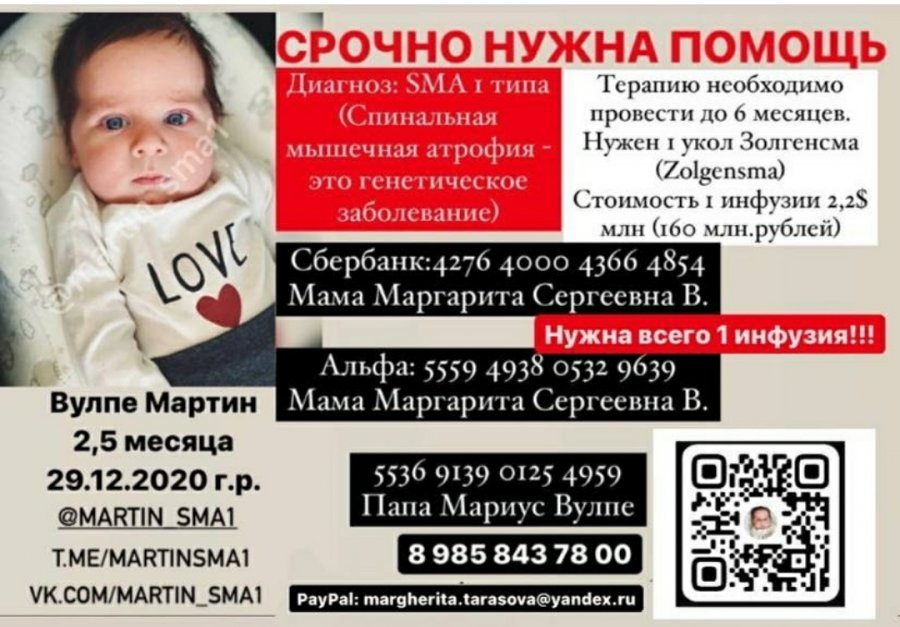 «К сожалению, мы с мужем стали жертвами статистики. Этими сороковыми жителями планеты... Без лечения ребенок не доживает до 2-х лет... Но спасти жизнь нашему сыну может всего лишь ОДИН укол препарата ЗОЛГЕНСМА ( Zolgensma). Нам необходимо сделать его сделать до 6 месяцев. Его стоимость составляет 2,2 млн. $ (долларов) = 160 000 000 рублей. Это самое дорогое лекарство в мире и оно нам жизненно необходимо. Чем раньше мы начнем лечение, тем эффективнее!