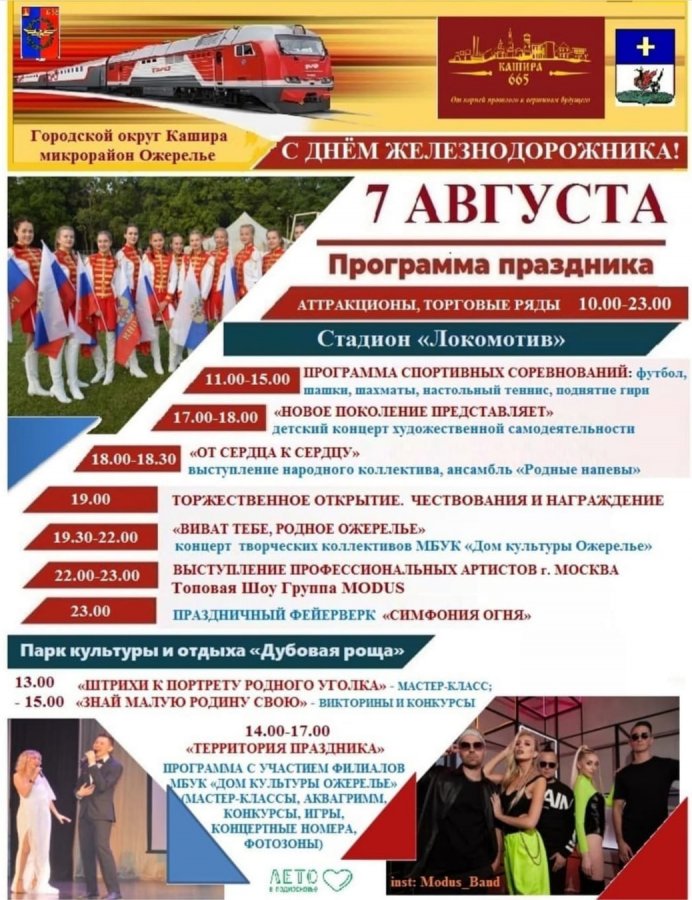 Праздничные мероприятия, посвященные прошедшему Дню железнодорожника, будут отмечать 7 августа в Ожерелье. Неофициальный День города (а сейчас микрорайона) планируют отмечать на стадионе «Локомотив» и в парке «Дубовая роща». Программа праздника начнется с 10:00. Будут работать аттракционы, торговые ряды, с 11:00 стартуют спортивные соревнования, в парке пройдут мастер-классы, конкурсы для детей.