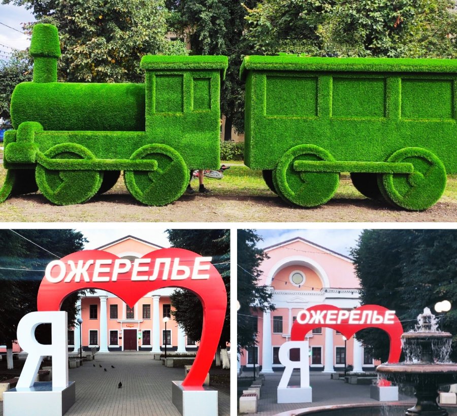 В центре Ожерелья на площади перед Домом культуры появились два новых декоративных объекта. В стороне у дороги установили топиарную фигуру паровоза. Один из узнаваемых символов города, который напоминает, что история Ожерелья прочно связана с железной дорогой. По аналогии с медведями у ФОК «Олимп» паровоз уже стал предметом повышенного внимания жителей, с ним охотно фотографируются, и, к сожалению, иногда взбираются сверху.