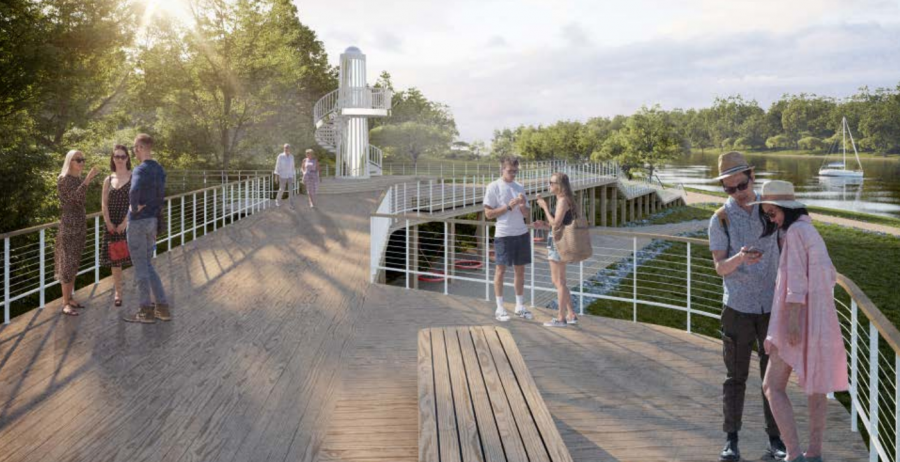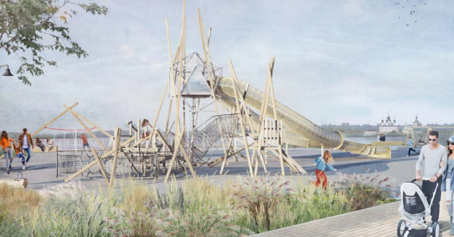 Понтонные причалы гибко реагируют на изменения уровня воды в Оке и дают остановочную площадку на водном пути между Серпуховым и Коломной. Детская площадка и «Облачный остров» будет выполнена из «природных» материалов и вписана в окружение, а спортивная площадка предлагает возможность активных занятий спортом на природе», – указано в документации.