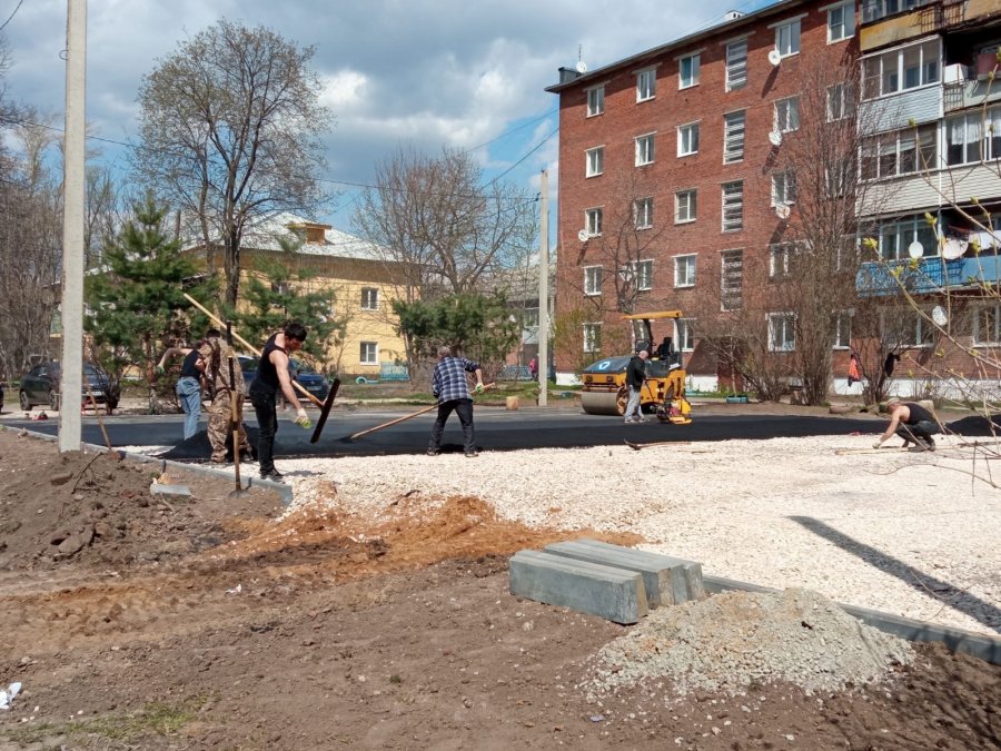 В настоящий момент идет укладка покрытия, установлены опоры освещения, а по просьбе жителей были пересажены сосны. После устройства основания будет нанесено травмобезопасное покрытие и установлены игровые элементы площадки. Как показывает практика, между этими этапами работы проходит, как минимум, несколько недель.