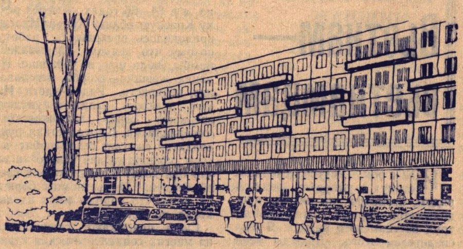 «Давайте мысленно очутимся в начале 1969 года и побываем в гастрономе. Огромный фасад весь занят стеклом. Его торговый зал легко просматривается с улицы, как бы приглашая непременно заглянуть внутрь. Такое впечатление, будто вообще нет стеклянных витражей», – так описывал в то время архитектор Миняков строительство дома с гастрономом.