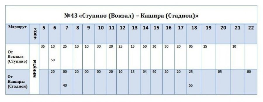 По информации Ступинской администрации, начиная с 20 января текущего года на маршруте №43 Кашира (Стадион) – «Ступино (Вокзал)» произойдут изменения в расписании.