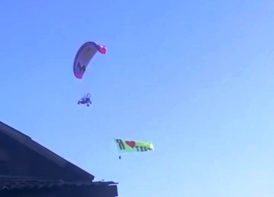В сетях очевидцы разместили видео с летящим на параплане мужчиной, который решил необычным способом признаться в своих чувствах. К летательному аппарату он прикрепил баннер с надписью: «Я люблю тебя».