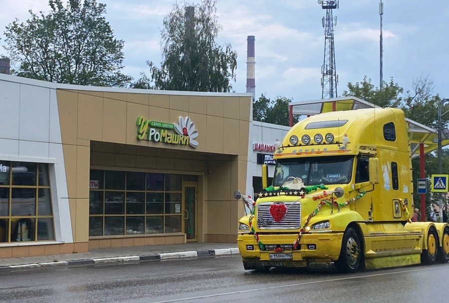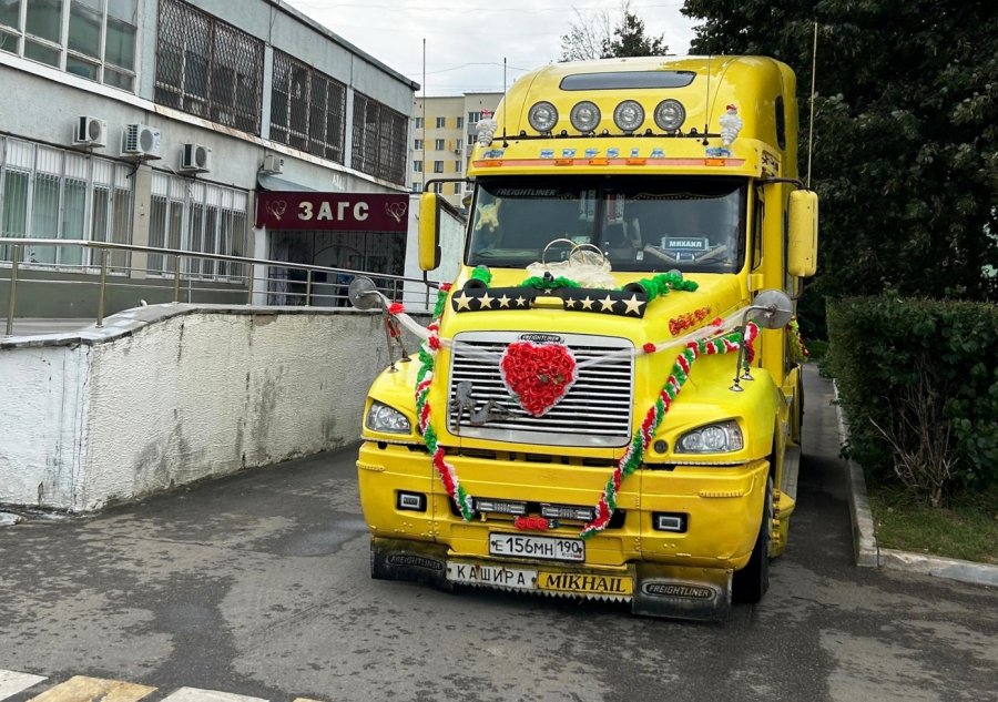 Необычный свадебный автомобиль заметили горожане возле Каширского отдела ЗАГС. Вместо привычных «окольцованных» легковых иномарок, у входа в здание стоял украшенный по всем свадебным канонам тягач американской фирмы «Freightliner». На желтом грузовике разместили сердце из цветов, ленты и украсили свадебными кольцами. По табличкам «Кашира» и «Mikhail» можно сделать предположение и о водителе, который приехал в ЗАГС на столь необычном транспортном средстве.