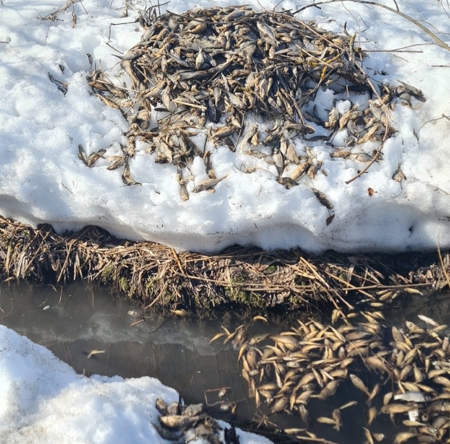 Другие пользователи сети поделились фотографиями этого же пруда зимой и весной. Видно огромное количество мертвой рыбы, плавающей на поверхности.