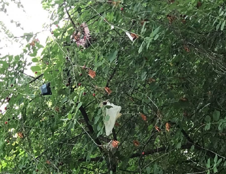 В подтверждение своих слов они приложили фотографии с усеянной разномастными отходами жизнедеятельности территорией под окнами и увешанными этим же мусором деревьями.