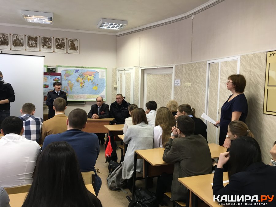 В преддверии празднования Дня защитника Отечества сотрудники Каширского отдела вневедомственной охраны и участники боевых действий в Афганистане и Чечне провели для старшеклассников "Урок мужества". Председатель Каширского отделения Общероссийской общественной организации "Российский Союз ветеранов Афганистана", участник боевых действий в Афганистане Михаил Ануров рассказал ученикам 11 "А" класса о героически погибших в Афганской и Чеченской войне каширянах, о своем боевом прошлом.