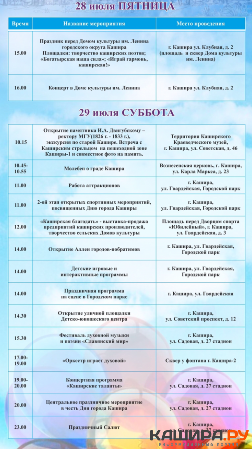 разднование Дня города Кашира уже состоится сегодня, а завтра 29 июля торжественные мероприятия продолжатся.