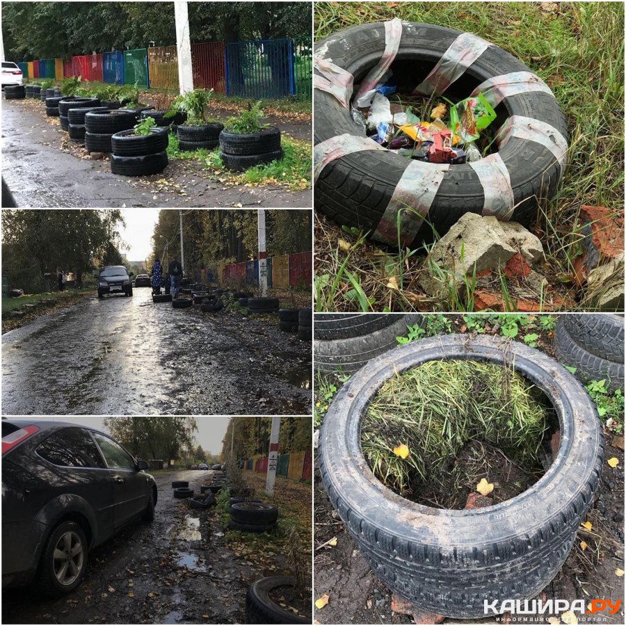 Эта необычная инсталляция из использованных автопокрышек появилась у школы №9 в Кашире относительно недавно. И почти сразу вызвала возмущения не только родителей школьников, но и тех, кто живет по соседству, которые обращались, в том числе, и к нам (цитата): «Там проблема с помойкой, мусор валят вокруг, жители соседних домов, поэтому и наложили эти шины, чем только усугубили! Все равно валят мусор, растения гибнут, грязь. Дети ходят, машины едут, в районе помойки и тротуара нет, идут по дороге все».