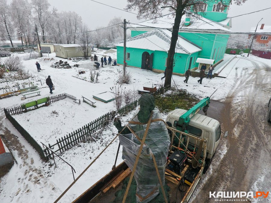 Скульптура, где Сергий Радонежский изображен идущим и благословляющим встречных двумя сложенными перстами, была установлена у храма Николы Ратного в Кашире-1.