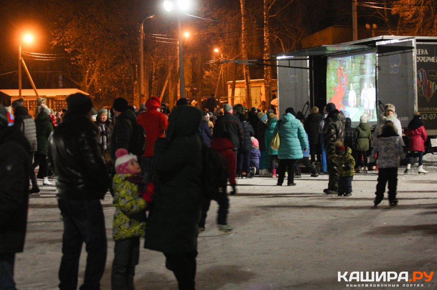 Сегодня вечером каток на стадионе «Локомотив» на станции Кашира собрал небывалый аншлаг. Объявление о бесплатном кинопоказе мультфильма «Три богатыря и морской царь» вкупе со ставшим традиционным для многих воскресным походом на ледовую площадку собрали на стадионе около тысячи человек, создав настоящую атмосферу праздника.