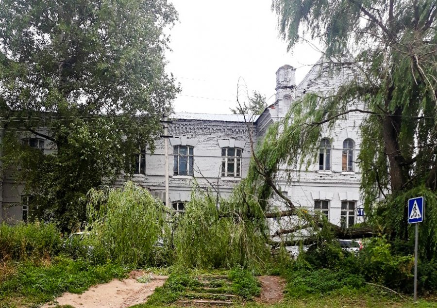 В тот момент у здания были припаркованы, по меньшей мере, шесть автомобилей. Владельцы уже успели их отогнать – в данный момент рабочие распиливают дерево, чтобы убрать его с импровизированной парковки.