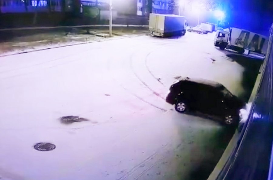 В ночное время водитель внедорожника, двигаясь со стороны магазина «Светофор», вылетел на тротуар и врезался в стену торгового центра «Звезда». Маневр водителя попал в объектив камеры видеонаблюдения.