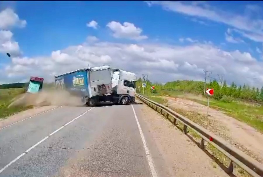 На видео можно заметить, как при попытке обгона одна из фур уходит дальше по полосе, а другая, не вписываясь в поворот, сносит остановочный павильон и разворачивается поперек дороги, сминая «отбойник». Находился ли кто-либо в момент столкновения на остановке, не до конца понятно. Только чудом удара избежал водитель легкового автомобиля, который двигался в противоположном направлении. В «рубашке» родился и владелец регистратора, который вовремя остановился и не стал продолжать движение. Видео: соцсети