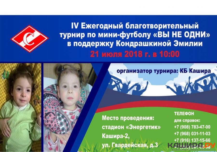 В субботу, 21 июля в 10:00 на стадионе «Энергетик» в парке культуры и отдыха Каширы-2 (ул. Гвардейская, 3) пройдет IV Ежегодный благотворительный турнир по мини-футболу «ВЫ НЕ ОДНИ» в поддержку Эмилии Кондрашкиной. Как говорится в сообщении, в турнире примут участие от 16 до 24 команд. Регламент турнира: 2 тайма по 10 минут, в команде - до 15 человек, 4 группы по 4 команды или 4 группы по 6 команд - в зависимости от числа участников. Команды, занявшие 1 и 2 место, выходят в золотой плей-офф; команды, занявшие 3 и 4 место, выходят в серебряный плей-офф, и далее играют по олимпийской системе на вылет. В случае ничьей пробивается по 3 пенальти. Также, помимо мини-футбольных соревнований, на турнире будут проводиться веселые старты для детей.