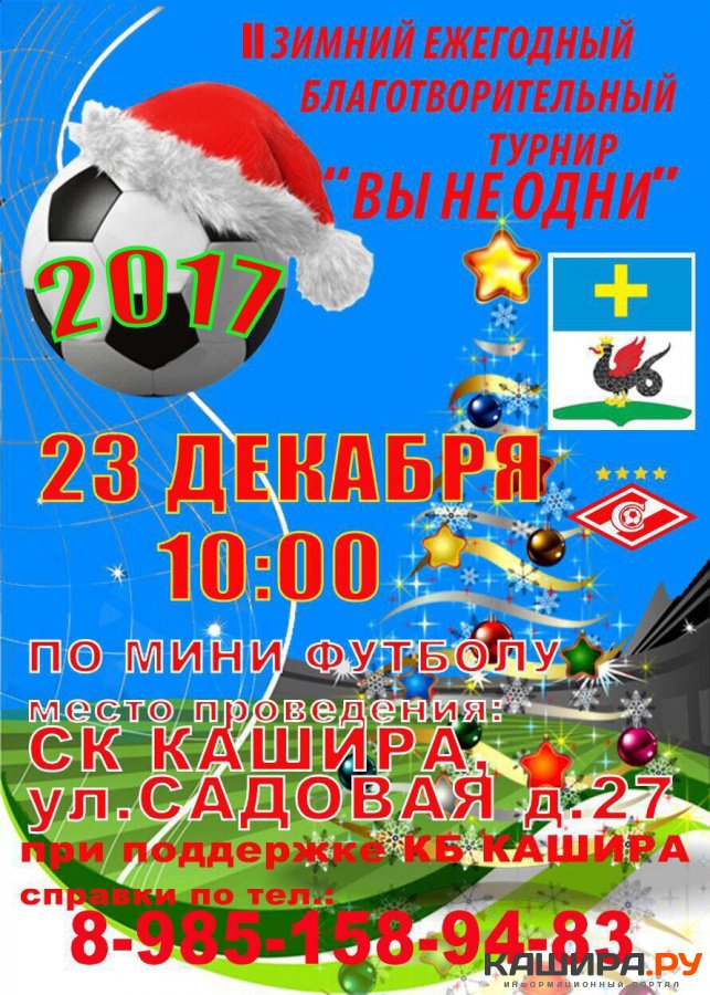 II зимний благотворительный турнир по мини-футболу «Вы не одни» пройдет в эту субботу, 23 декабря, в Спортклубе «Кашира» им. Н.П. Елисеева. Как можно догадаться из реноме соревнований, главной целью их проведения будет благотворительность: все собранные средства, сообщают организаторы, пойдут на подарки малоимущим детям на Новый год. На текущий момент определен и список из восьми команд, которые примут участие в субботнем турнире. Заявки подали ФК «Бригадир», «КБ Кашира», «Каширские поросята», «Баффало», «Спартак Кашира», «Сверни Горы», ФК «Авангард» и «Росгвардия». Начало жеребьевки намечено на 9:40; в 9:50 состоится открытие соревнований. Команды сыграют в двух группах (игра состоит их двух таймов по 10 минут), после чего определят призеров в «золотом» и «серебряном» турнирах плей-офф.