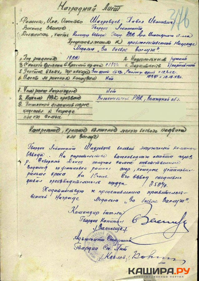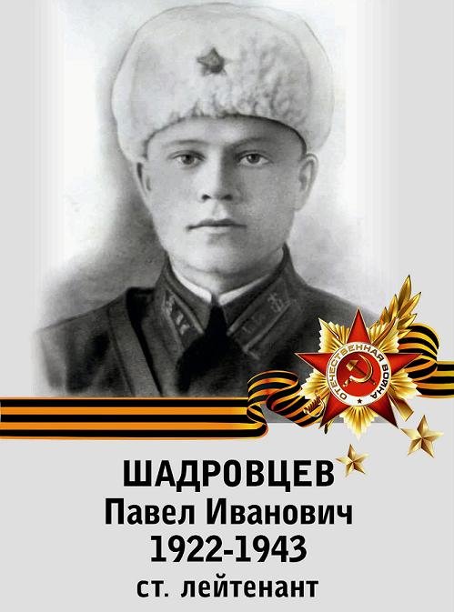 Брат дедушки Шадровцев Павел Иванович (1922 – 08.05.1943 гг.) – старший лейтенант инженерных войск, окончил Ленинградское военно-инженерное училище, защищал Москву, участвовал в битвах под Сталинградом, много раз был ранен, погиб на Юго-западном фронте, будучи командиром инженерного батальона, невероятный труженик, отличный командир. Выписка из документа: «Место призыва: Великосельский РВК, Вологодская обл. Гвардии Лейтенант Шадровцев волевой энергичный командир взвода (322 Гвардейского Армейского инженерного батальона). На строительстве высоководного моста через р. Северский Донец получал самые ответственные задания по установке рамных опор, которые установил раньше срока на 10 часов. Его взвод ежедневно давал производительность труда 350 %». Имеет медаль «За боевые заслуги».
