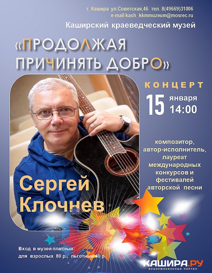 15 января в Каширском краеведческом музее состоялся концерт композитора, автора-исполнителя, лауреата международных конкурсов и фестивалей авторской песни,