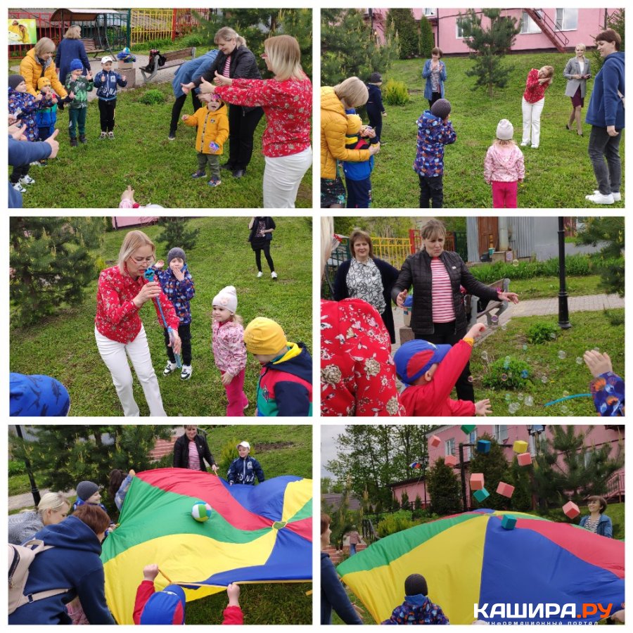 Психолог проводит игры с детьми и взрослыми в День открытых дверей. Музыка, движения, мыльные пузыри, карусель с мячом, салют из мягких кубиков - очень весело было детям и взрослым!