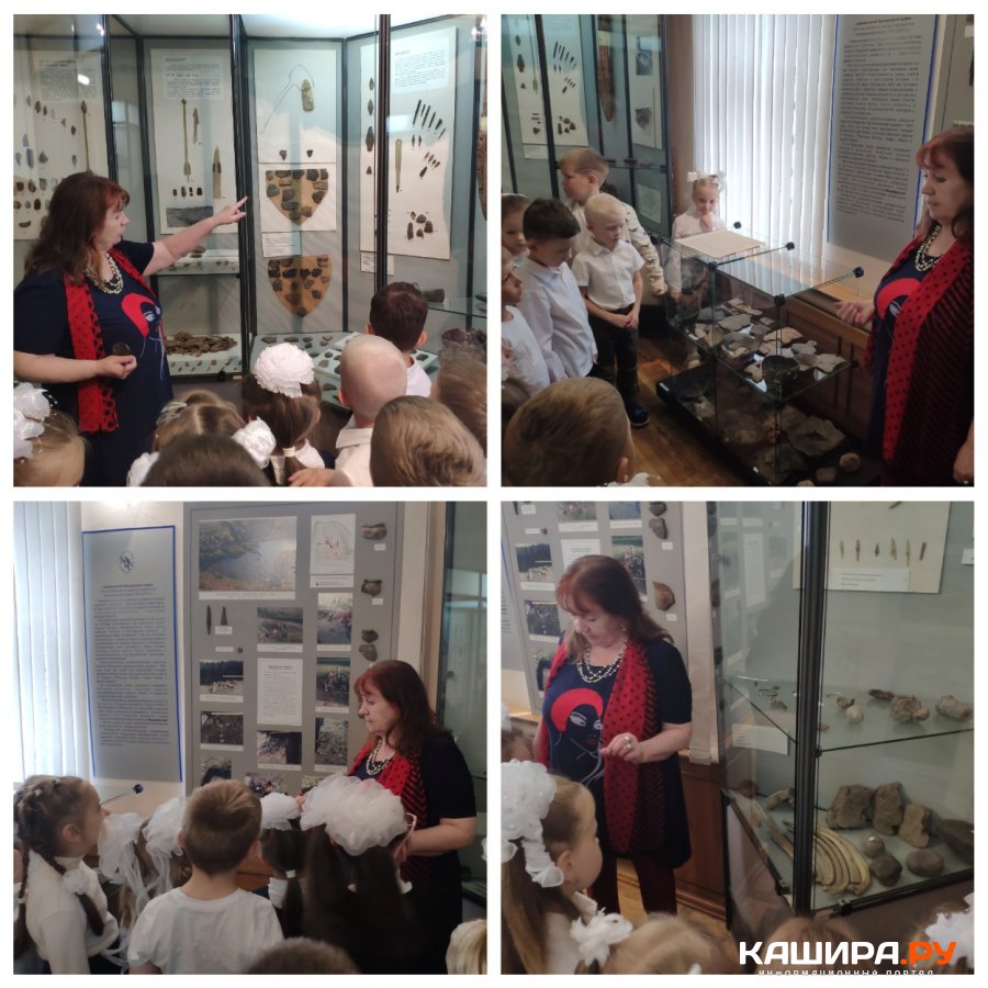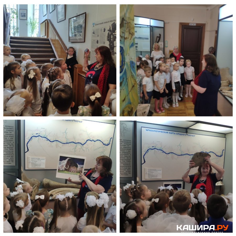 Как интересно! Неужели в нашем районе обнаружены бивни мамонта, и он был около четырёх метров в высоту? А сколько зубов было у мамонта и как они выглядят? Правда четыре? На какое животное похож мамонт? А чем слон отличается от мамонта? Об этом ребята узнали у первой витрины. Первые эмоции восхищения и удивления. Откуда пошло название нашего города? Как появились названия городов Кашира, Калуга, Коломна? Какая река объединяет все эти города? Опять было интересно узнать не только дошкольникам, но взрослым.