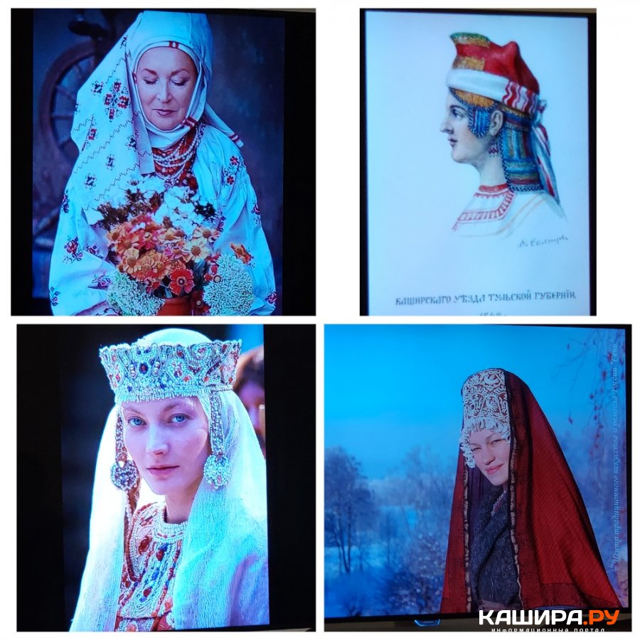 Головной убор каширянки в правом верхнем углу.С головным убором каширянки можно познакомиться с помощью рисунка, выполненным в 1842 году. На нём тоже изображено полотенце, повязанное вокруг головного убора.