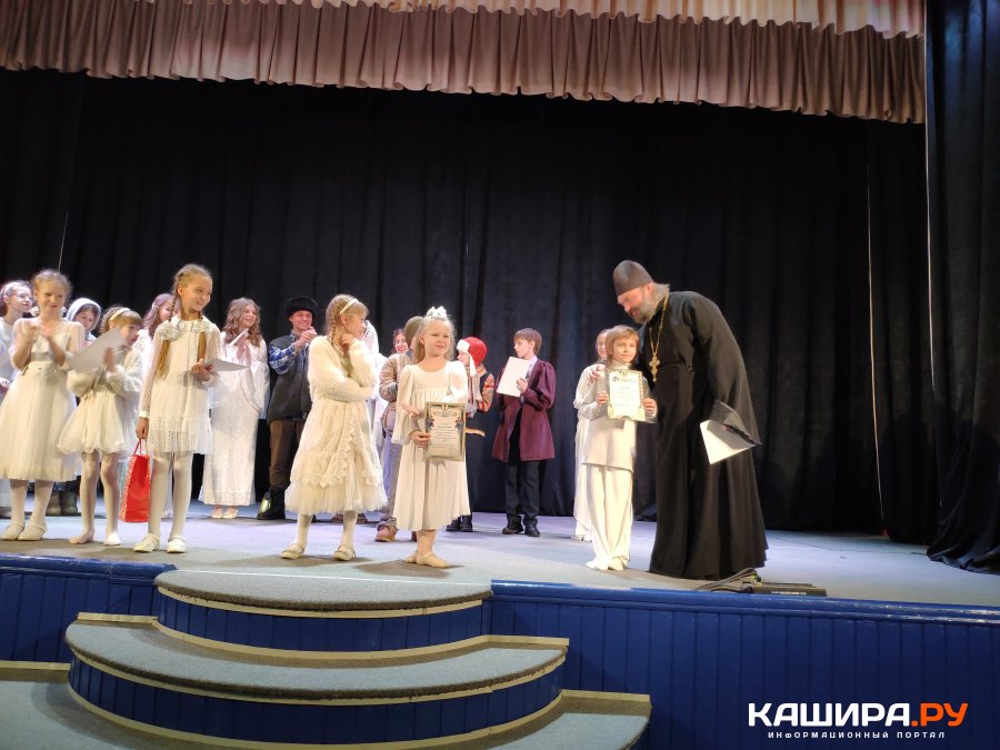 С благословением и праздничным поздравлением к собравшимся обратился Благочинный церквей Каширского округа священник Валерий Сосковец. Его речь всегда интересна, поучительна. О. Валерий умело общается с детьми, предоставляя им возможность проявить свои знания по православию, истории праздника Рождества. Дети закрепили знания о звезде на ёлке, которая символизирует Вифлеемскую восьмиконечную звезду, ещё раз услышали историю рождения Христа. Священник подчеркнул, что Рождественские открытки, выполненные руками детей, это подарок самому Богу, так что все дети молодцы, их старания оценены. О. Валерий поздравил всех со светлым праздником Рождества Христова.
