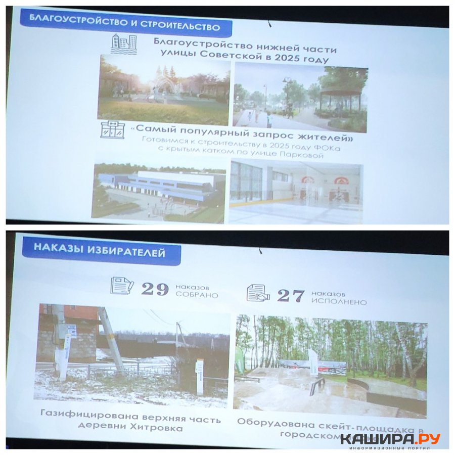 Поднимались вопросы о дискотеках для молодёжи, о нехватке детских садов в Кашире 1, о ремонте стадиона «Спартак» (2026 году стадион будет капитально отремонтирован), о невозможности получения высшего образования в Кашире, о заброшенном здании бани и других зданий (в здании банка планируется организовать картинную галерею), о заброшенных территориях Лесхозмаша и вдоль Оки.