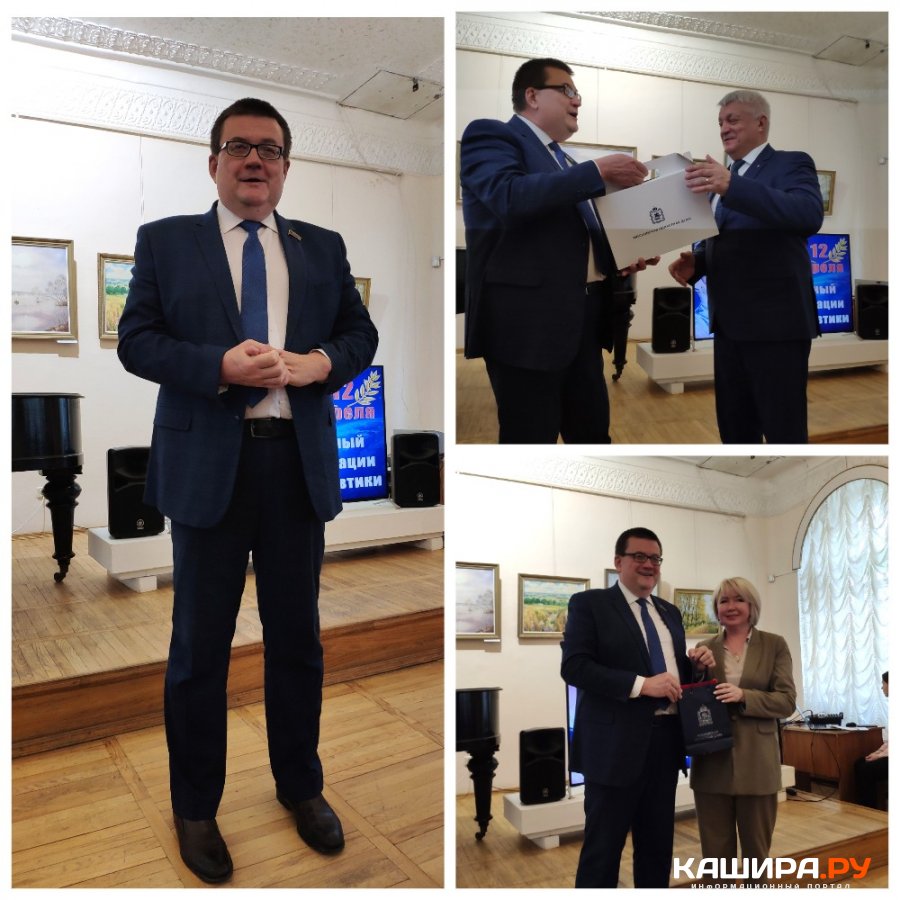 - …Мы сегодня собрались, чтобы вспомнить о том подвиге, который совершил 12 апреля 1961 года первый человек, покоривший космос, Юрий Алексеевич Гагарин, русский человек; вспомнить о том прорыве, который совершил наш народ через 16 лет после завершения тяжелейшей Великой Отечественной войны, открыв дорогу всему человечеству в космос. Сегодня у нас ещё одно важное событие. Наш почётный гость, Алексей Владимирович Кузьмин, долгие годы возглавлял Управление МВД на космодроме Байконур, сегодня он передаст Каширскому краеведческому музею уникальные экспонаты, связанные не только с нашей отечественной космонавтикой, но и с общемировым освоением космоса. Это важное событие для всей нашей каширской земли.
