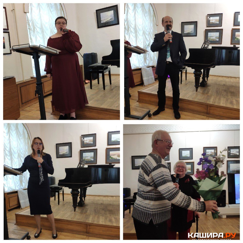 Замечательная каширская художница Людмила Владимировна Маковская с супругом Владимиром Николаевичем поздравили Константина Эдуардовича с открытием выставки, рассказали о своих впечатлениях. Людмила Владимировна тоже работает с акварелью, поэтому хорошо понимает коллегу. Художница рассказала об Оке, о том, что она дорога каждому каширянину, о своей молодости, прошедшей на берегах реки. Супруги вручили цветы, выращенные собственными руками, герою встречи.