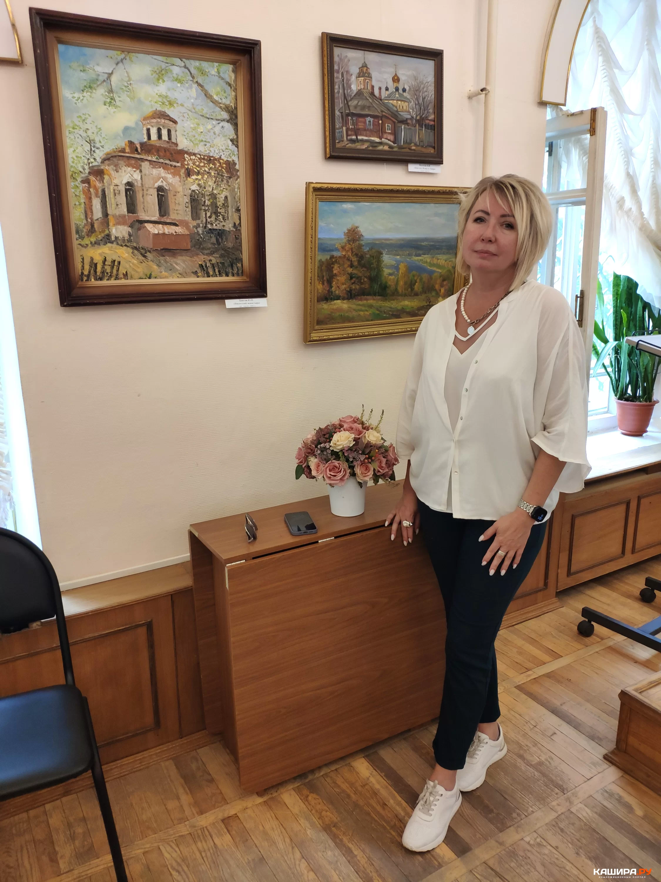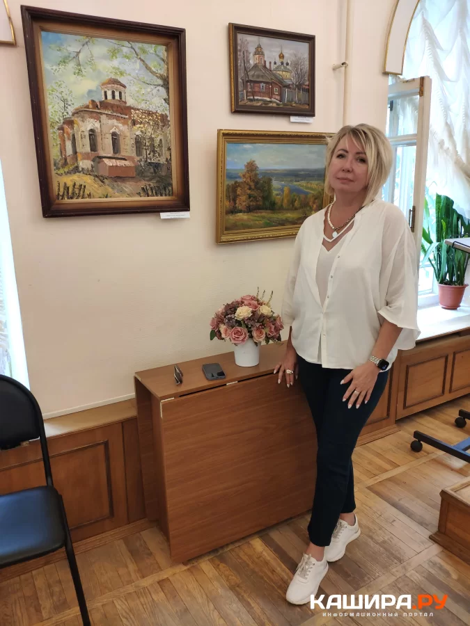 Татьяна Николаевна Рожкова поздравила всех с Днём рождения города, рассказала, что в Кашире проживает 35 лет, занимается с детьми, обучает их живописи, рисунку. Заверила присутствующих, что эта выставка останется в памяти и мотивирует другими глазами смотреть на здания, на всё окружение, на природу. Татьяна Николаевна поблагодарила коллектив краеведческого музея за предоставление помещения для выставки картин, поделилась, что у каждого художника по сотни картин дома стоят, негде выставить.